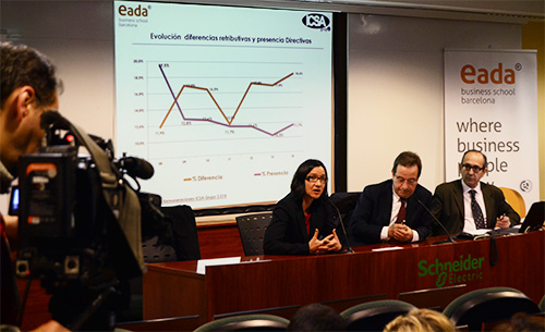 Barcelona, 7 de marzo de 2014- Pese a la muy leve mejora en la cuota de presencia de las directivas, la mujer española sigue sufriendo una doble discriminación laboral. Ésta se manifiesta en la menor retribución en todas las categorías profesionales y en la dificultad de acceso a los mejores puestos y salarios. En concreto, la presencia de la mujer en los puestos directivos mejor retribuidos (Dirección General y Dirección Comercial) no llega al 9%. Estos datos se desprenden del 8º informe anual Diferencias retributivas hombre-mujer presentado hoy por EADA e ICSA. El trabajo se ha elaborado a partir de una muestra que recoge datos salariales de más de 80.000 individuos empleados por cuenta ajena en España, captados a través de encuestas y plataformas tecnológicas como www.cuantomepagan.com
