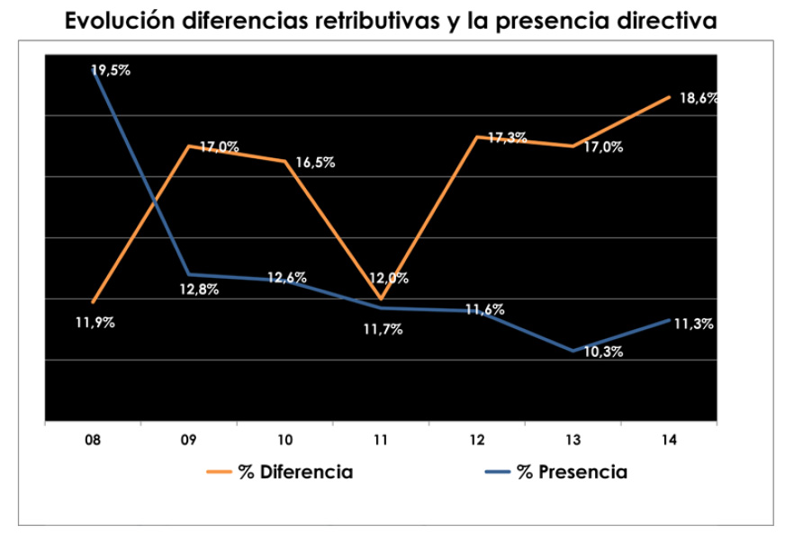 Las mujeres ocupan el 11,7% de los puestos directivos en España, lo que supone un escaso aumento respecto al 10,3 del 2013, registro que marcó la culminación de un descenso sostenido desde el año 2008, cuando se alcanzó la cifra de casi un 20% de directivas. Sin embargo la brecha salarial casi ha aumentado en la misma proporción, alcanzando un 18,6%, concretamente un 1,6% más que en el año anterior. En cifras absolutas, la retribución media actual de un directivo es de 84.625 euros brutos anuales mientras que la de homóloga femenina es de 71.337 €. Tal y como se observa en el gráfico existe una combinación, una ecuación perversa que se ha cumplido durante todos estos años, por la cual crisis= menor presencia femenina y mayor desigualdad salarial.