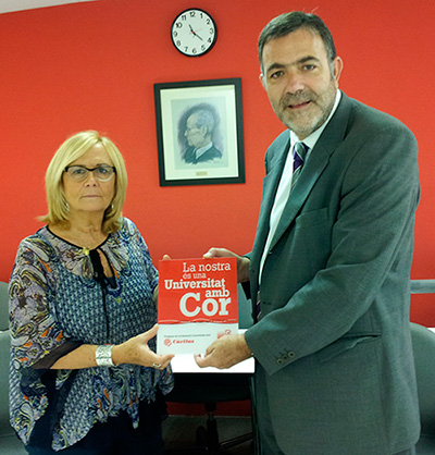 En la foto, Montse Padilla, secretaria general de Cáritas Diocesana de Barcelona, entrega a Miquel Espinosa, director general de EADA, la placa que acredita que EADA es una “Universitat amb cor”.
