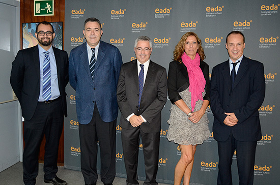 De izquierda a derecha, Xavier Amores, uno de los gestores del clúster y profesor de Marketing de EADA, Miquel Espinosa, director general de EADA, Jaume Carol, presidente de CWP, Lourdes Cortada, Corporate manager de EADA, y Pau Roig, director del área Corporate de EADA.