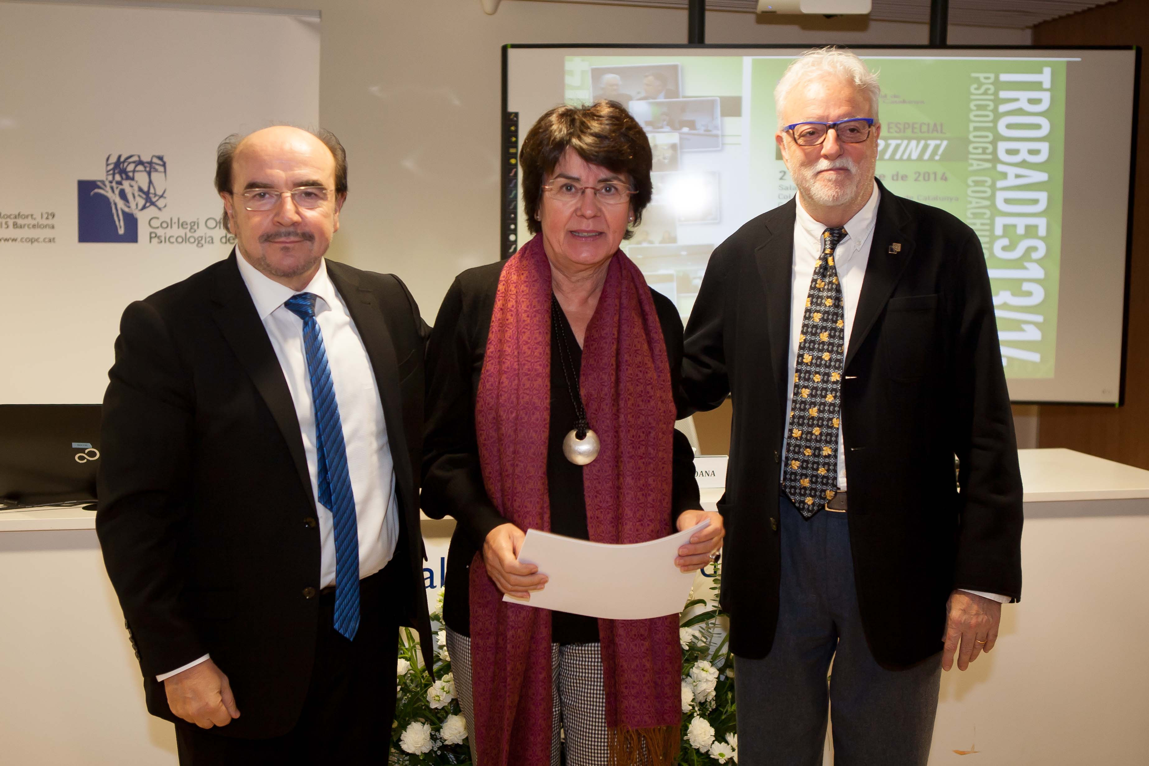 La profesora de EADA María Luisa Crespo en el momento en que recibió el premio junto a Joan Vilajoana (izquierda), decano del Colegio Oficial de Psicólogos de Catalunya, y Juan Carlos Jiménez (derecha), presidente de la sección de Psicología Coaching del Colegio Oficial de Psicólogos de Catalunya.